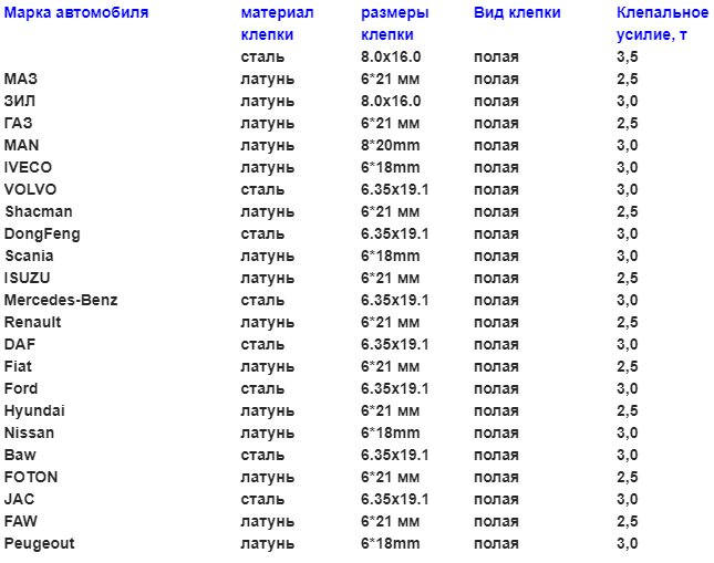 Минимальные клепальные усилия, требуемые для тормозных колодок грузовых автомобилей