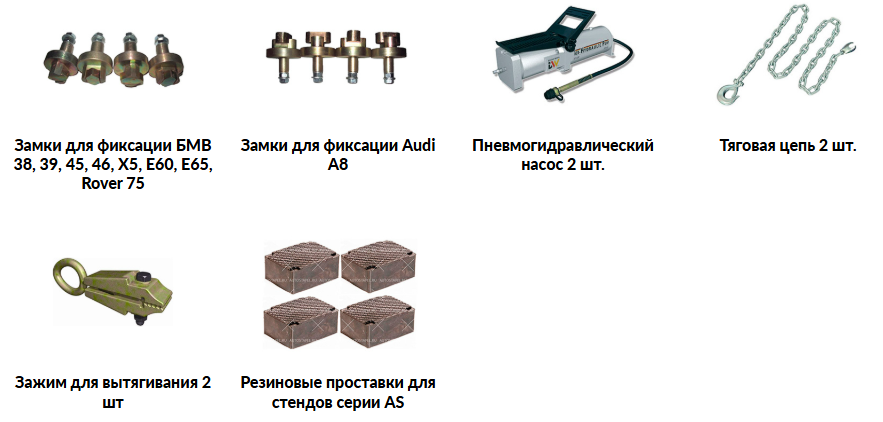 Усиленные зажимы за отбортовку порогов имеют оригинальную конструкцию разработанную с учетом устранения эффекта сползания и срыва. Узел сопряжения зажима со стойкой фиксации позволяет закрепить автомобиль с искривленной геометрией порогов не ограничивая дальнейших перемещений детали кузова в плоскости и одновременно удерживать его в момент исправления. Конструкция зажимов не имеет аналогов и разработана с учетом опыта и пожеланий российских мастеров кузовного дела.