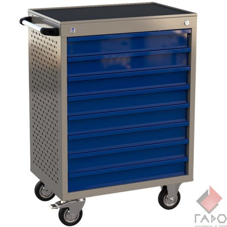 Инструментальная тележка ML8C изготавливаются из высококачественной стали толщиной 1,0 мм. Описание модели: 8 выдвижных ящиков, колеса, ручка, центральный замок, резиновый коврик, цвет: корпус синий, ящик серый. Закрытые тележки комплектуются центральным замком на все выдвижные ящики. 8 ящиков высотой 72 мм по лицевой панели (полезная глубина 60 мм).