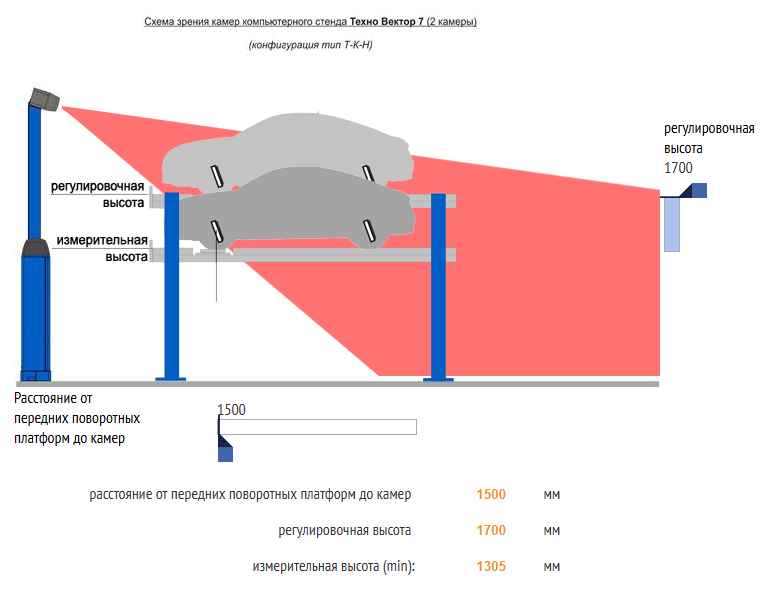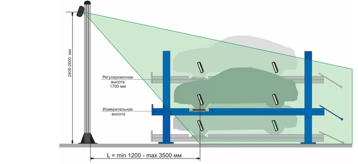 Двухкамерные стенды сход-развал ТехноВектор 7 могут использоваться как на яме так и на подъемнике, для предварительного расчета рабочих высот подъемника можно воспользоваться приведенной ниже системой.